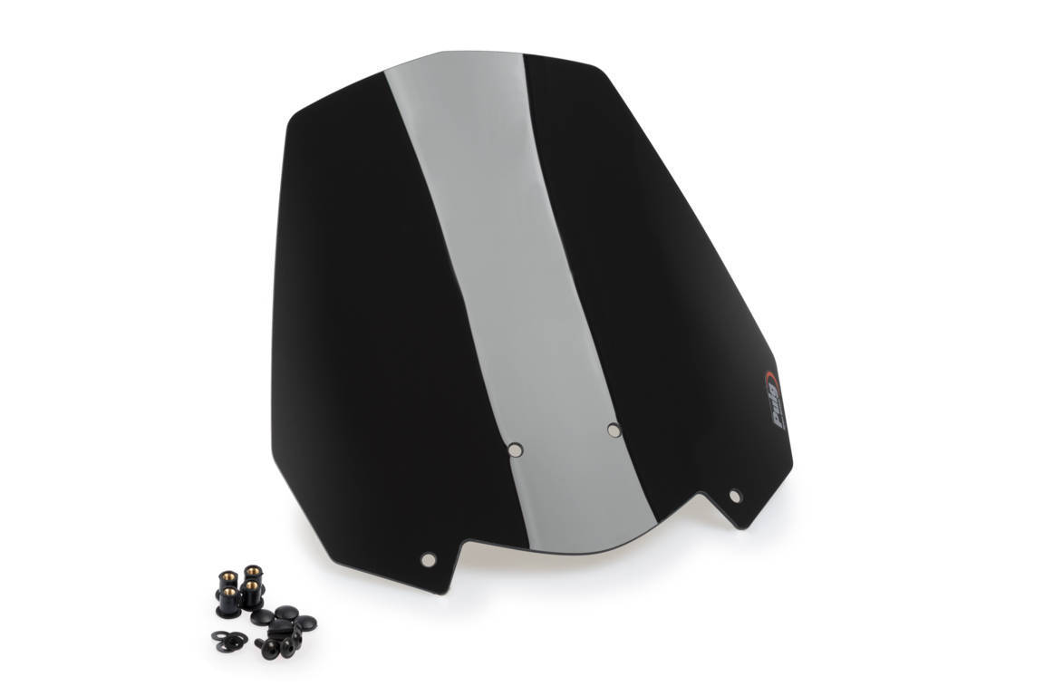 El carenabris Puig Sport es una cúpula corta diseñada para mejorar la protección a la hora de rodar en la Ktm, pero manteniendo un buen campo de visión y sin modificar en exceso la estética de la moto. La pantalla está fabricada en polímero termoplástico con un grosor de pantalla de unos 3-4 mm y un canto redondeado de 2 mm para no perjudicar al usuario y cumplir con la exigente normativa alemana tüv.